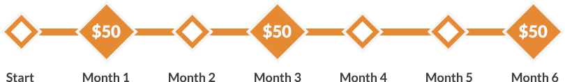 Say you introduced your favorite pizza place to OwnerListens and they sign up for and deploy OwnerListens for $50 per month for at least six months. You will receive a total of $150. Here's a handy timeline of what that looks like: